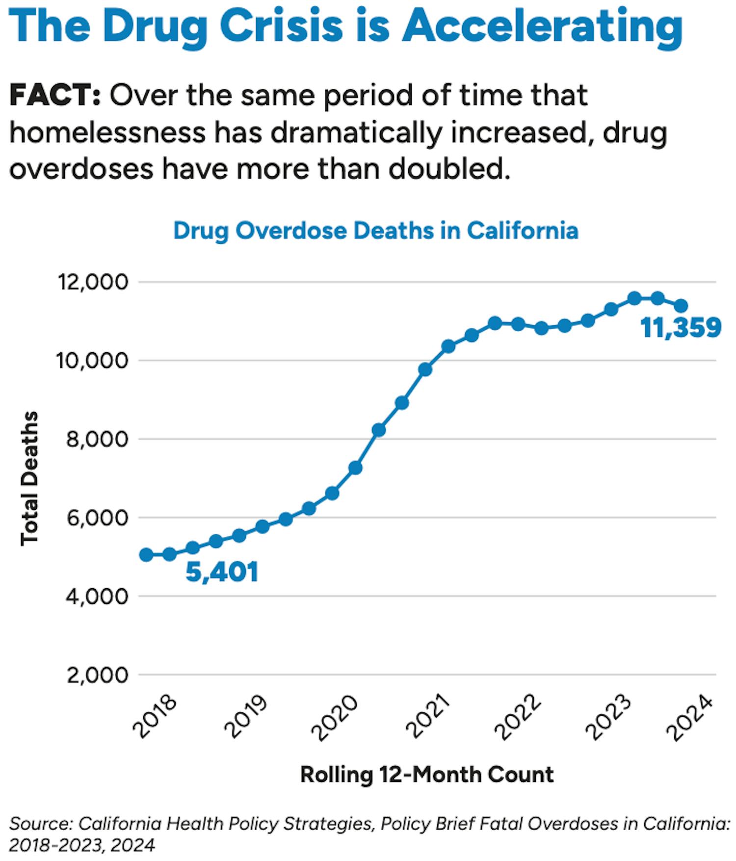 Drug overdose deaths in California have more than doubled, and homelessness has increased by about 45% since 2018.