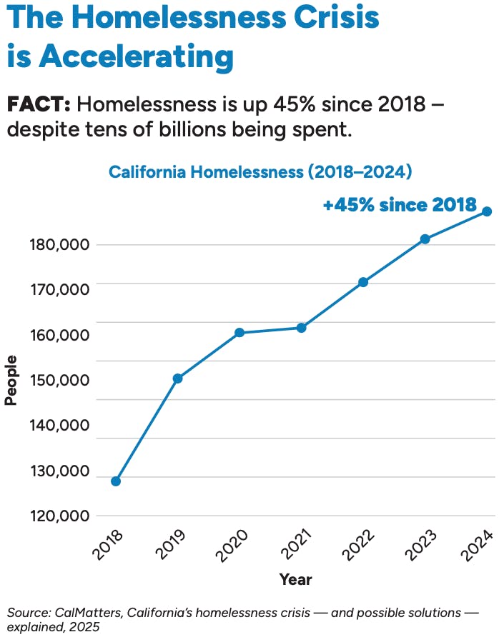 Since 2014, California has seen a sharp rise in homelessness, even as most other states have seen reductions. Today, more than 180,000 Californians are homeless, and nearly half struggle with substance abuse.